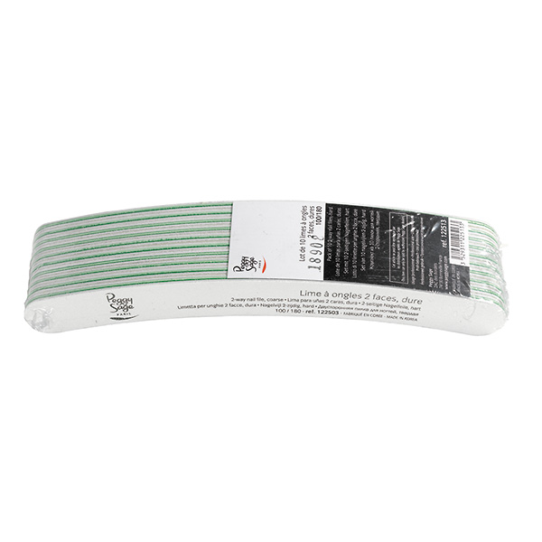 Lote de limas curvas para u’as de 2 caras, blanco, de grano 100/180. Mayor confort, gracias a la forma ergonómica de la lima curva. Recomendaciones de uso: Utilizar como una lima clásica. Limar las u’as siempre en el mismo sentido, para evitar que se abran. Utilizar el grano apropiado para el tipo de u’a.